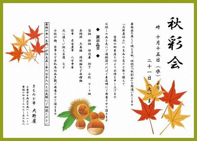 展示会のお知らせ ![]() 「 秋彩会 」 開催のお知らせ 2025年10月15日(水)から21日(火)まで 19日の日曜日も営業致します 大野屋店内にて開催 秋物の新柄商品を色々と取り揃えて皆様の御来店をお待ちしております お探しの商品が有れば前もってご連絡頂ければ、ご来店時に見て頂けるようにご用意させて頂きますのでお気軽にお声かけ下さいませ また、着物や帯のお手入れもお気軽にご相談くださいませ |