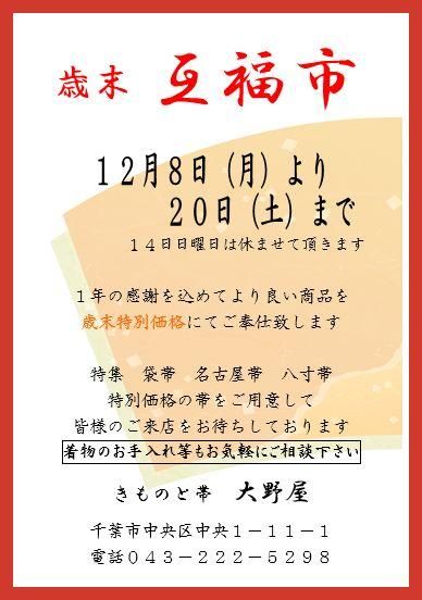 展示会のお知らせ ![]() 「 歳末 互福市 」 開催のお知らせ 2025年12月8日(月)から20日(土)まで 14日の日曜日は休ませて頂きます 大野屋店内にて開催 大野屋在庫の商品を歳末特別価格でご奉仕致します 今年の互福市では、各種 帯をお買い得に 皆様の御来店をお待ちしております お探しの商品が有れば前もってご連絡頂ければ、ご来店時に見て頂けるようにご用意させて頂きますのでお気軽にお声かけ下さいませ また、着物や帯のお手入れもお気軽にご相談くださいませ |